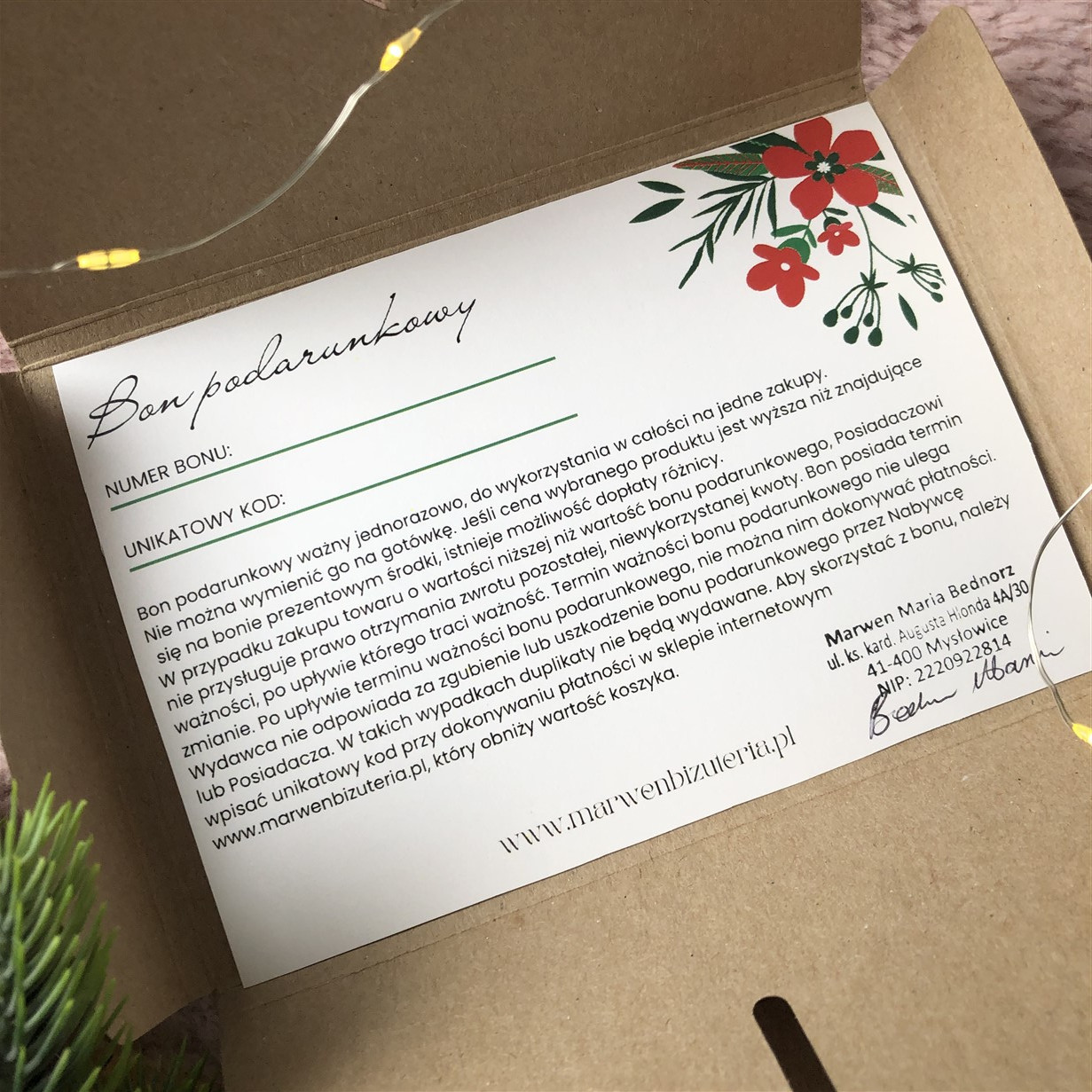 Bon podarunkowy ważny jednorazowo, do wykorzystania w całości na jedne zakupy. Nie można wymienić go na gotówkę. Jeśli cena wybranego produktu jest wyższa niż znajdujące się na bonie prezentowym środki, istnieje możliwość dopłaty różnicy. W przypadku zakupu towaru o wartości niższej niż wartość bonu podarunkowego, Posiadaczowi nie przysługuje prawo otrzymania zwrotu pozostałej, niewykorzystanej kwoty. Bon posiada termin ważności, po upływie którego traci ważność. Termin ważności bonu podarunkowego nie ulega zmianie. Po upływie terminu ważności bonu podarunkowego, nie można nim dokonywać płatności. Wydawca nie odpowiada za zgubienie lub uszkodzenie bonu podarunkowego przez Nabywcę  lub Posiadacza. W takich wypadkach duplikaty nie będą wydawane. Aby skorzystać z bonu, należy wpisać unikatowy kod przy dokonywaniu płatności w sklepie internetowym www.marwenbizuteria.pl, który obniży wartość koszyka.