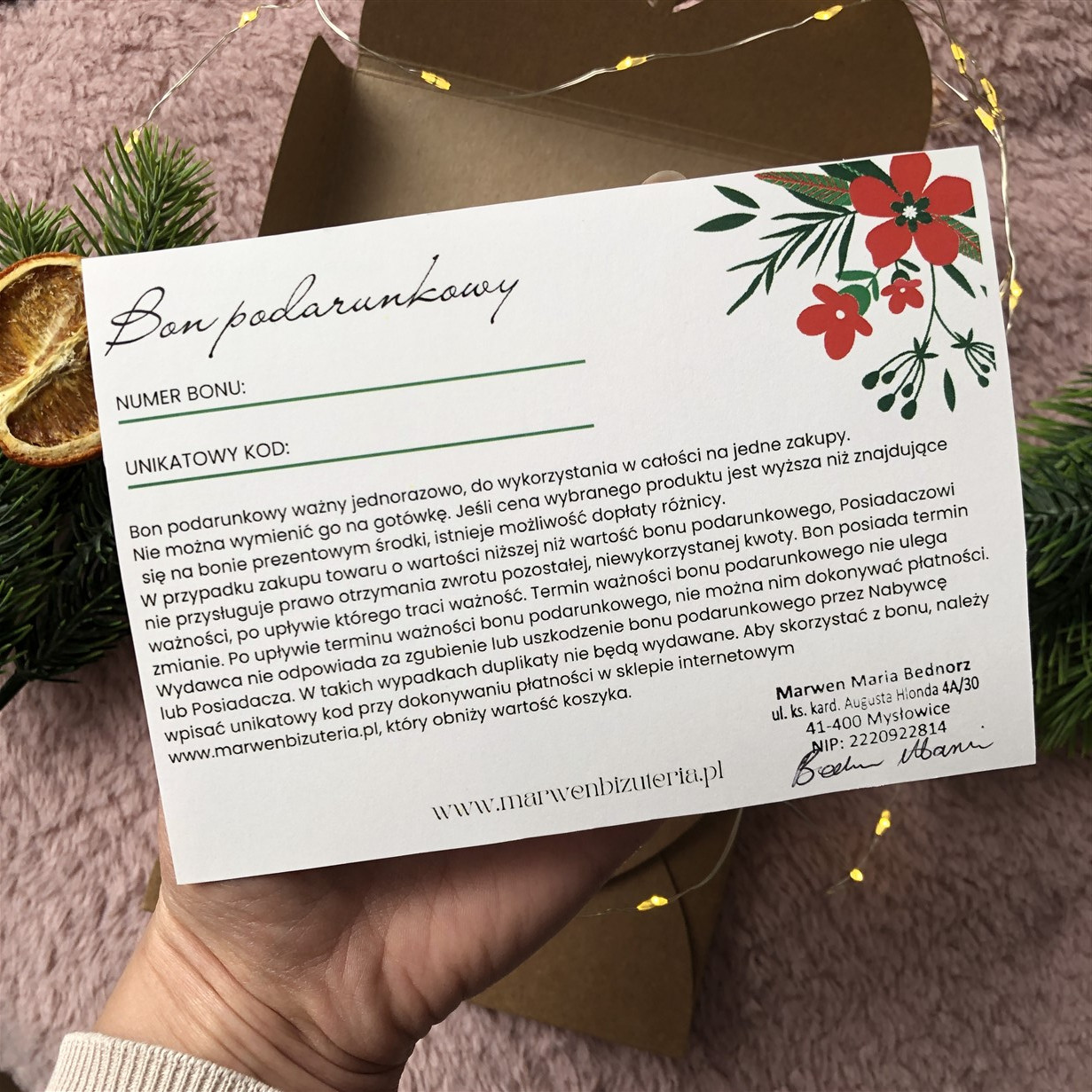 Bon podarunkowy ważny jednorazowo, do wykorzystania w całości na jedne zakupy. Nie można wymienić go na gotówkę. Jeśli cena wybranego produktu jest wyższa niż znajdujące się na bonie prezentowym środki, istnieje możliwość dopłaty różnicy. W przypadku zakupu towaru o wartości niższej niż wartość bonu podarunkowego, Posiadaczowi nie przysługuje prawo otrzymania zwrotu pozostałej, niewykorzystanej kwoty. Bon posiada termin ważności, po upływie którego traci ważność. Termin ważności bonu podarunkowego nie ulega zmianie. Po upływie terminu ważności bonu podarunkowego, nie można nim dokonywać płatności. Wydawca nie odpowiada za zgubienie lub uszkodzenie bonu podarunkowego przez Nabywcę  lub Posiadacza. W takich wypadkach duplikaty nie będą wydawane. Aby skorzystać z bonu, należy wpisać unikatowy kod przy dokonywaniu płatności w sklepie internetowym www.marwenbizuteria.pl, który obniży wartość koszyka.
