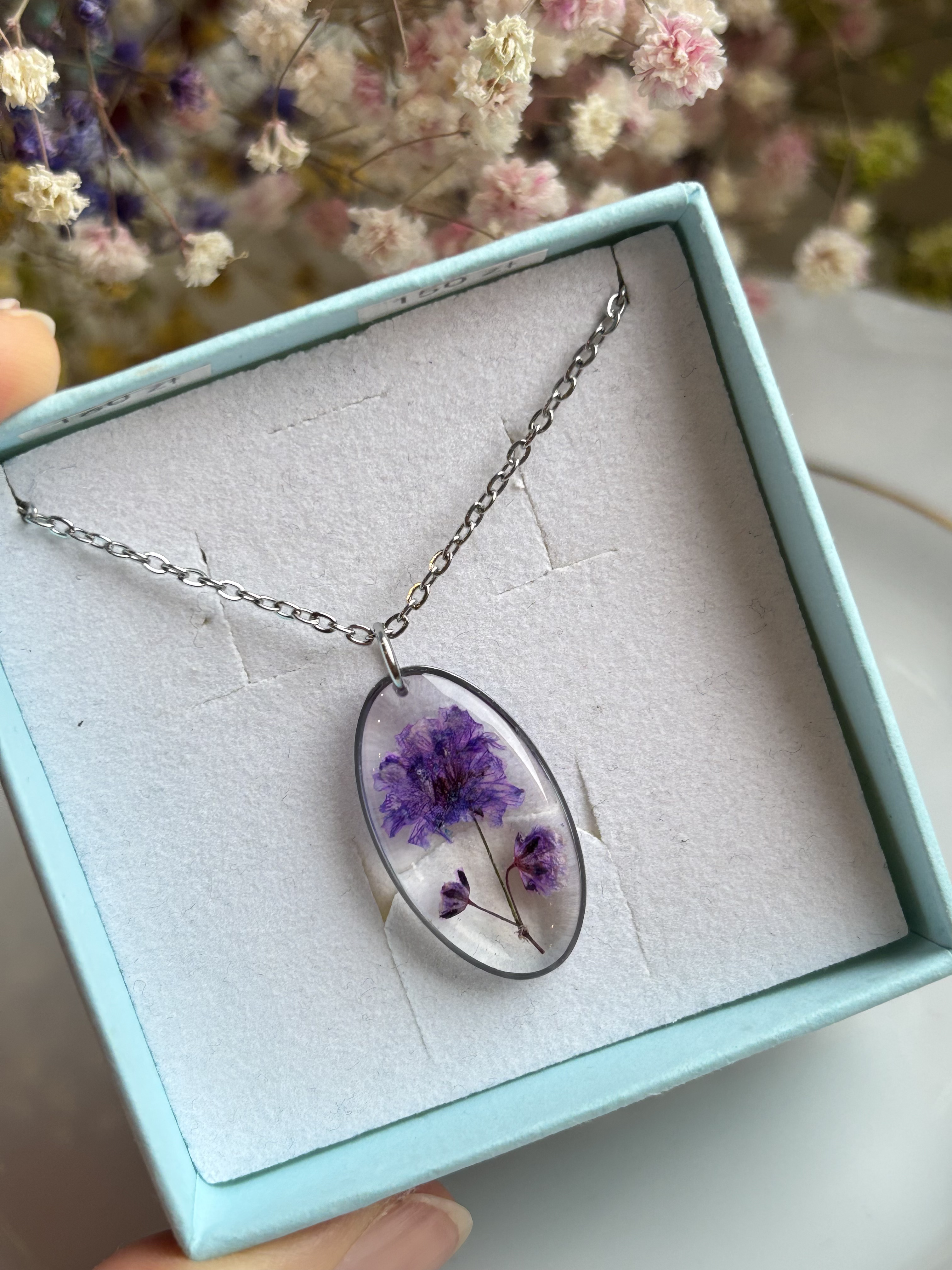 Piękny naszyjnik z ręcznie robioną zawieszką z żywicy z kwiatami gipsówki.