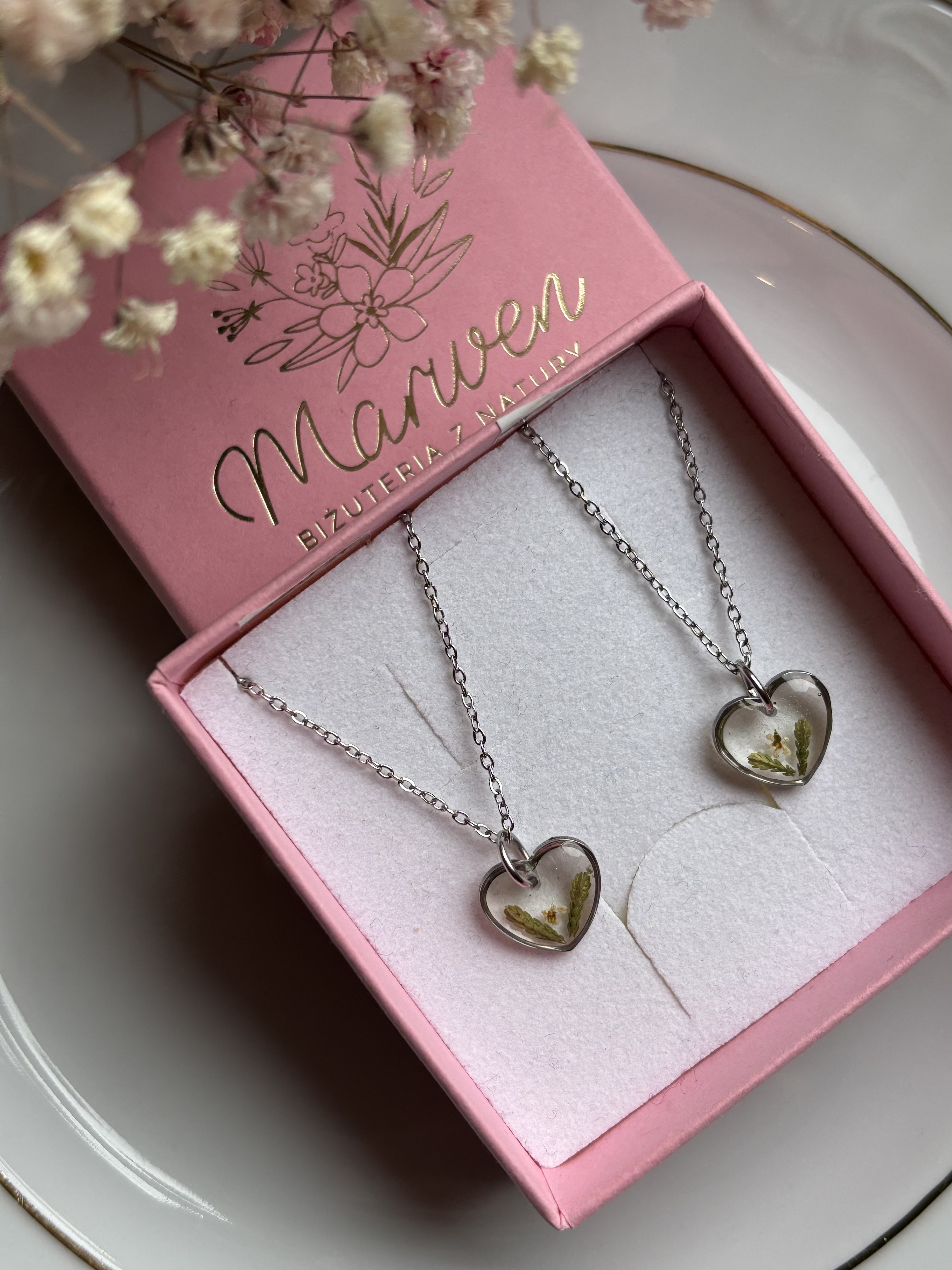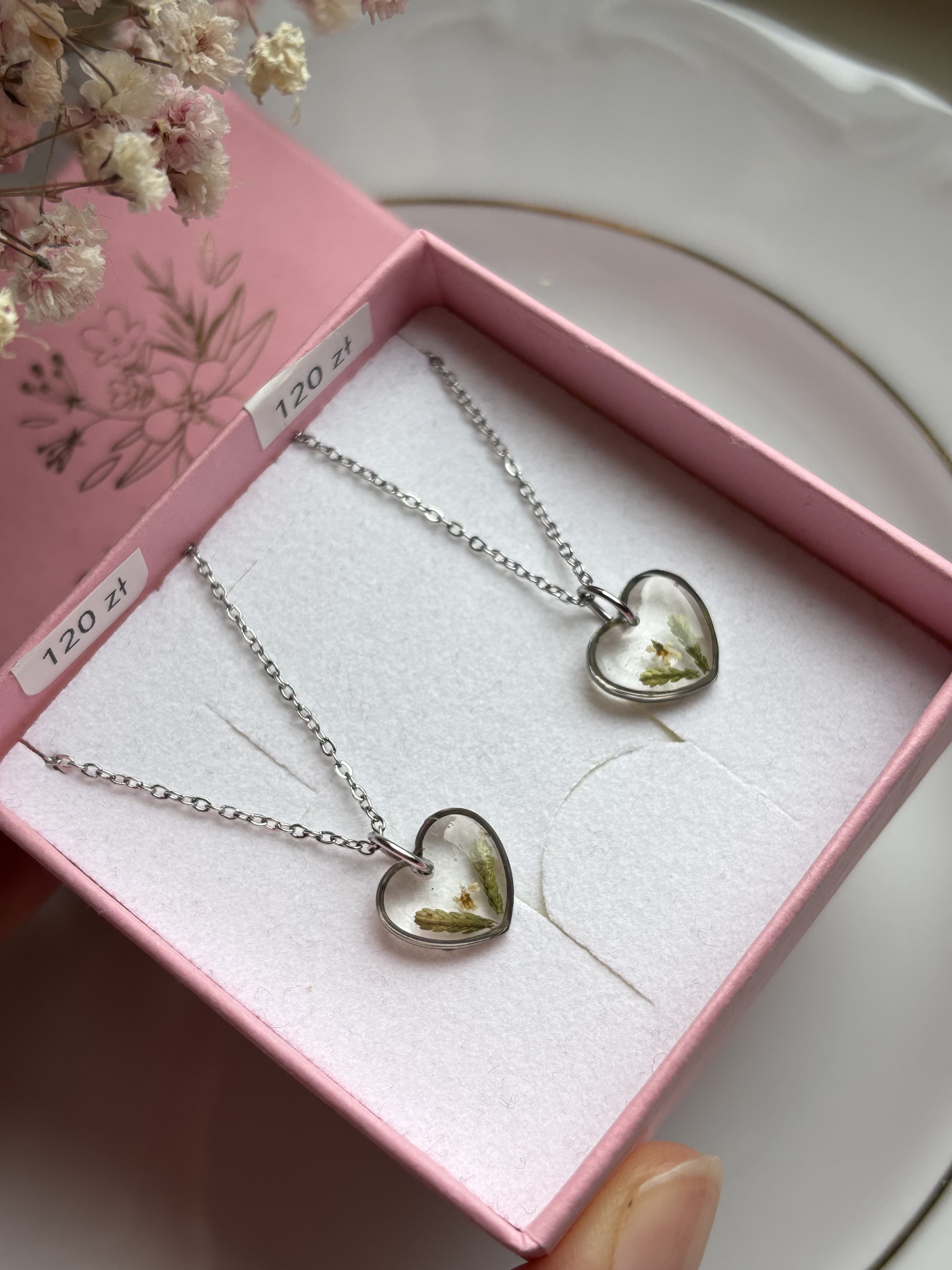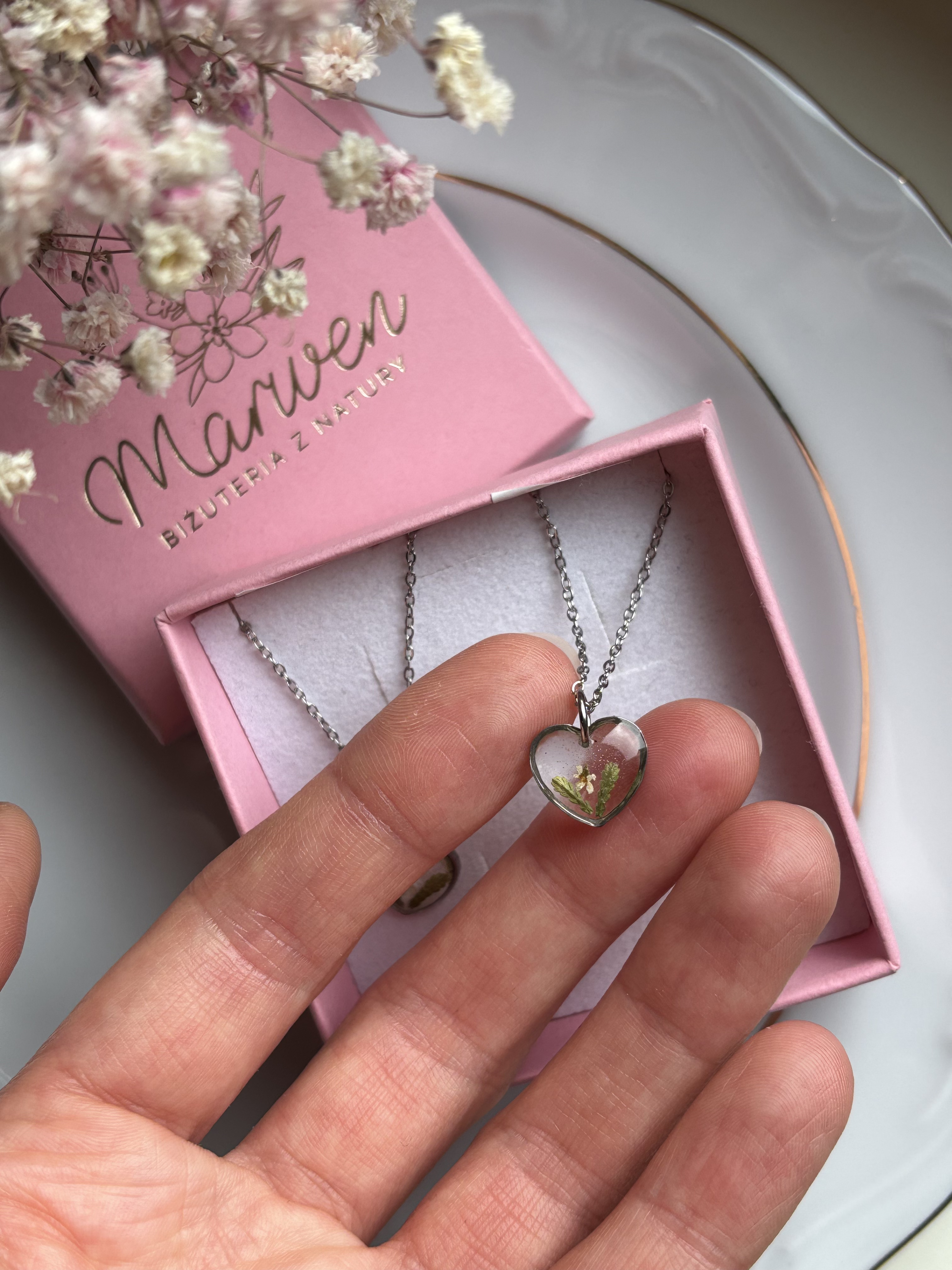 Minimalistyczny naszyjnik z ręcznie robionym serduszkiem z żywicy z kwiatami.