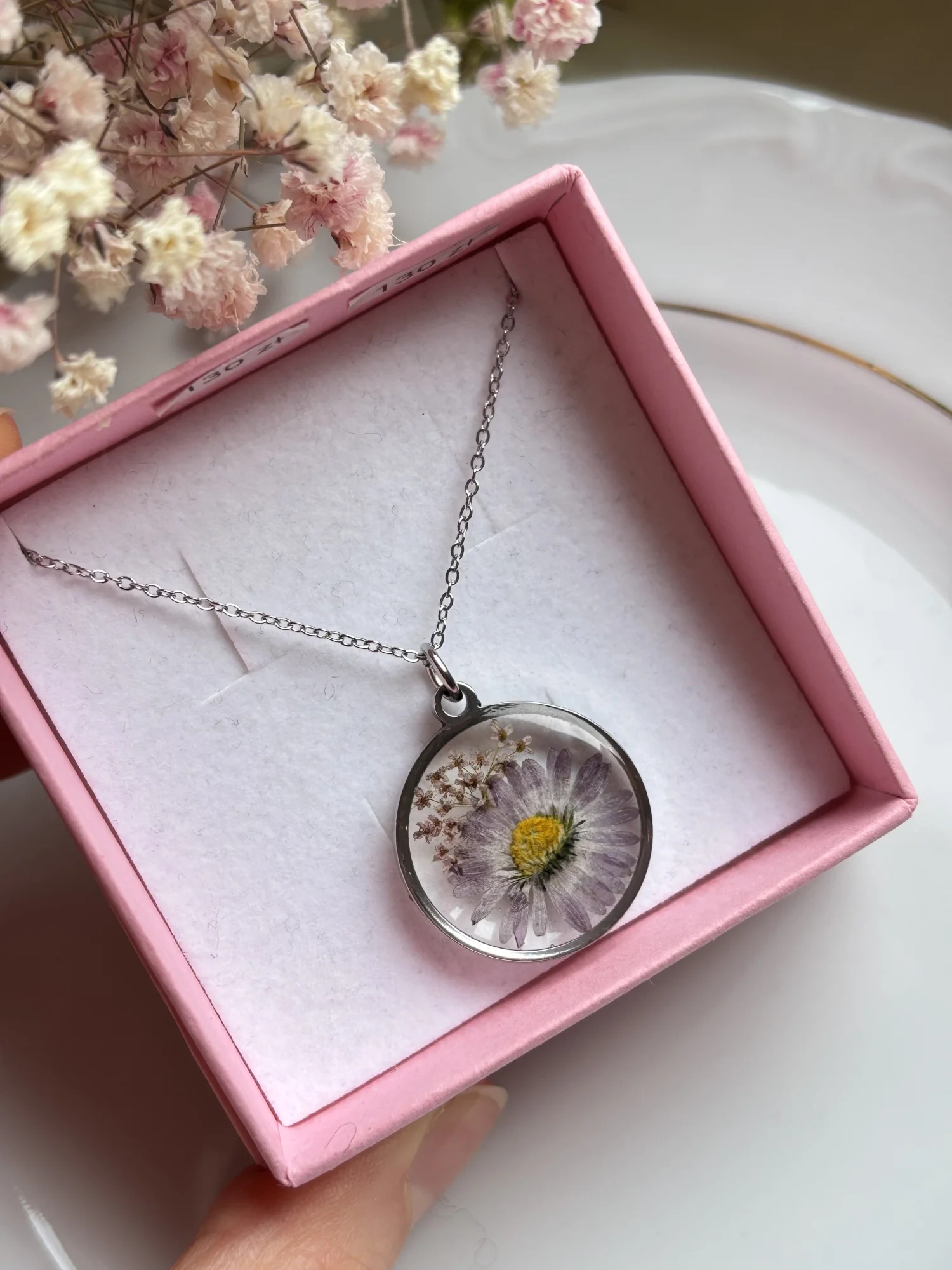 Piękny naszyjnik z ręcznie robioną zawieszką z żywicy ze stokrotką.