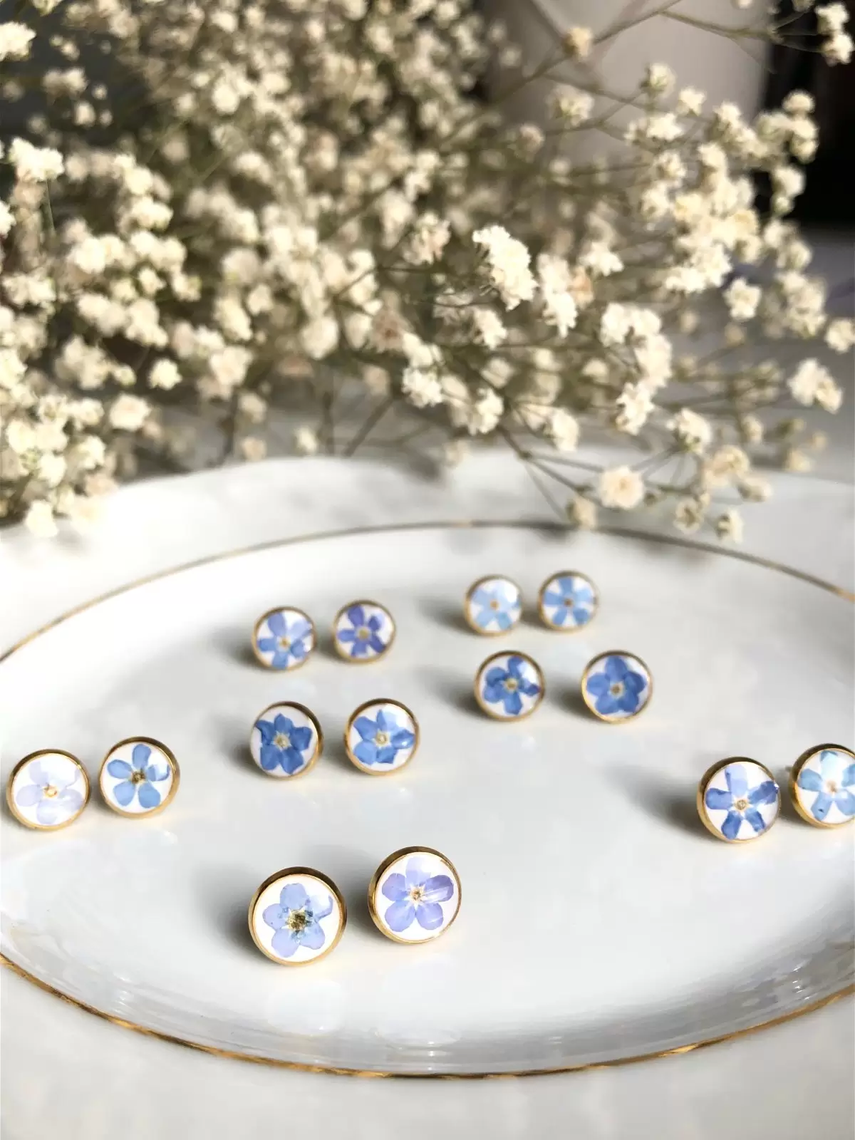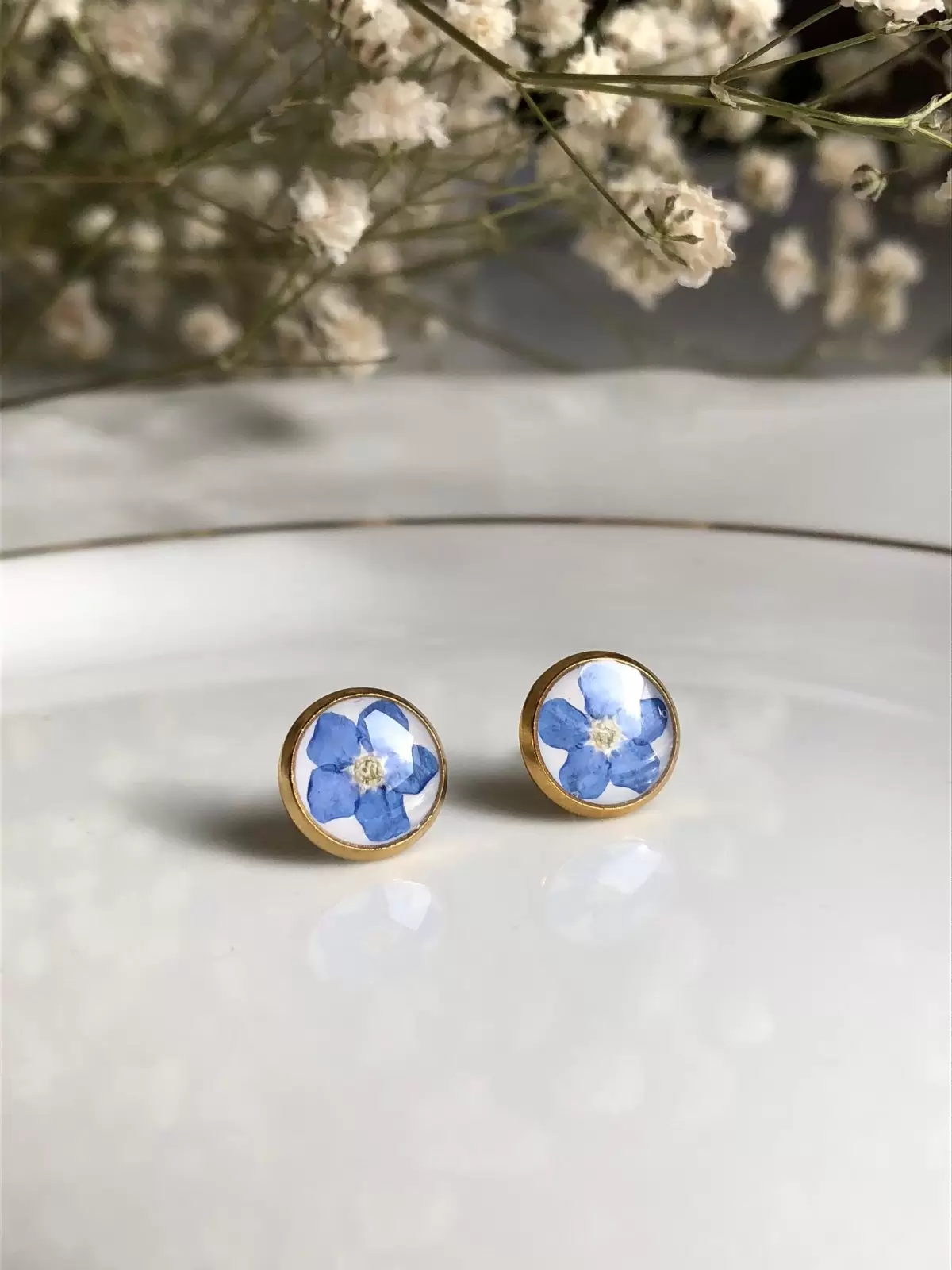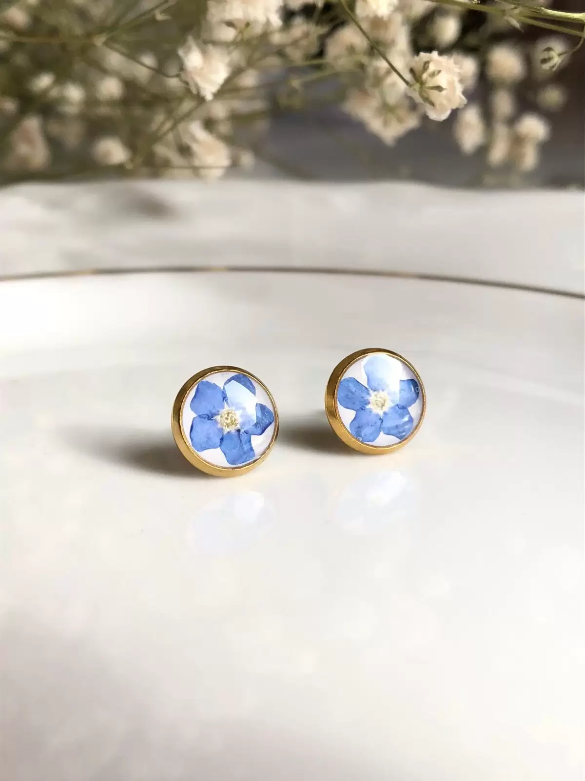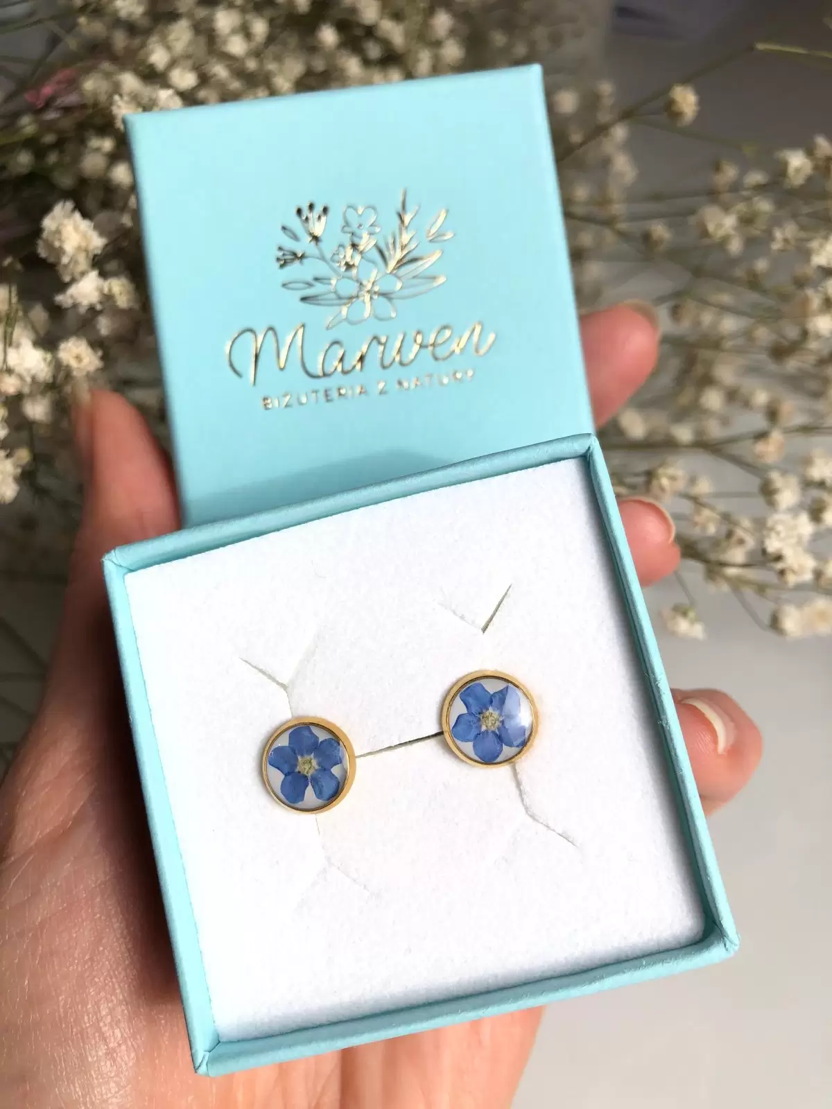 Przepiękne kolczyki wkrętki w kształcie koła. Na białym tle zostały misternie ułożone i starannie wyselekcjonowane kwiaty: niezapominajki.
