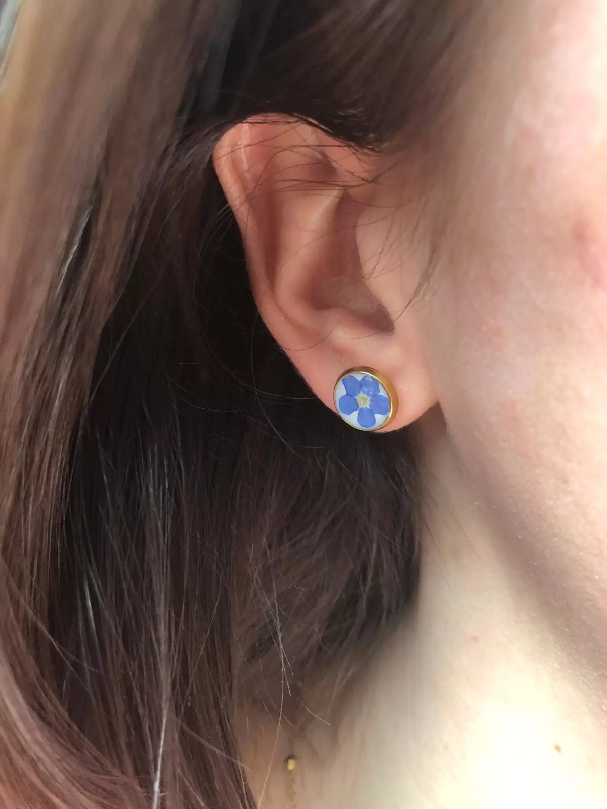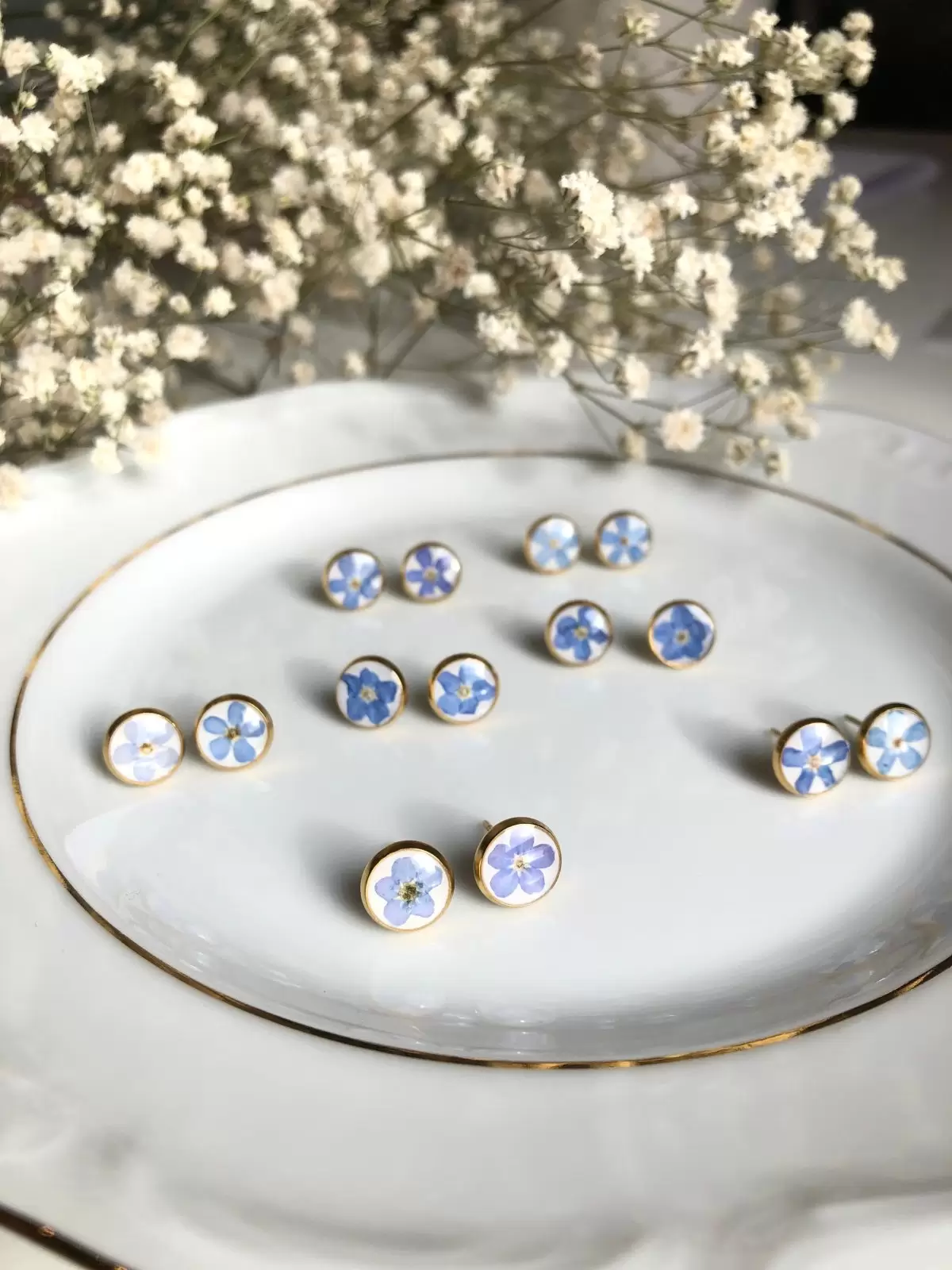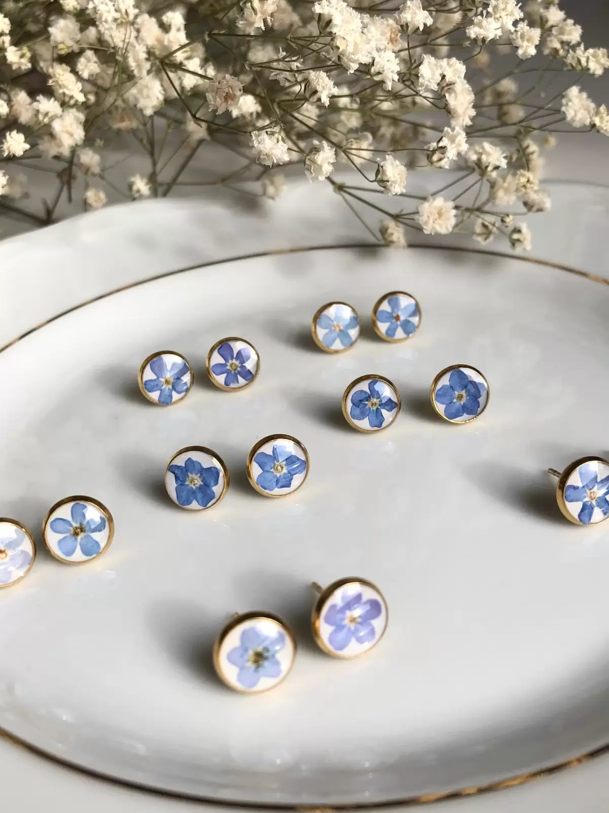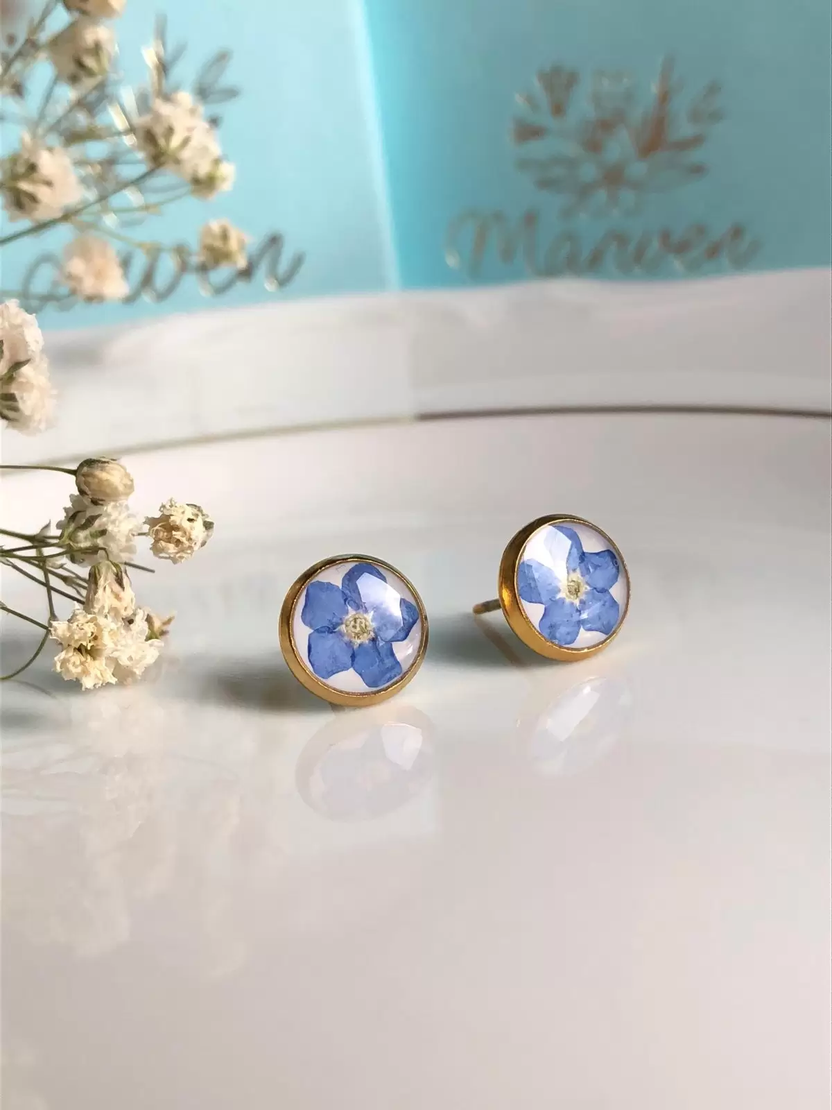 Przepiękne kolczyki wkrętki w kształcie koła. Na białym tle zostały misternie ułożone i starannie wyselekcjonowane kwiaty: niezapominajki.