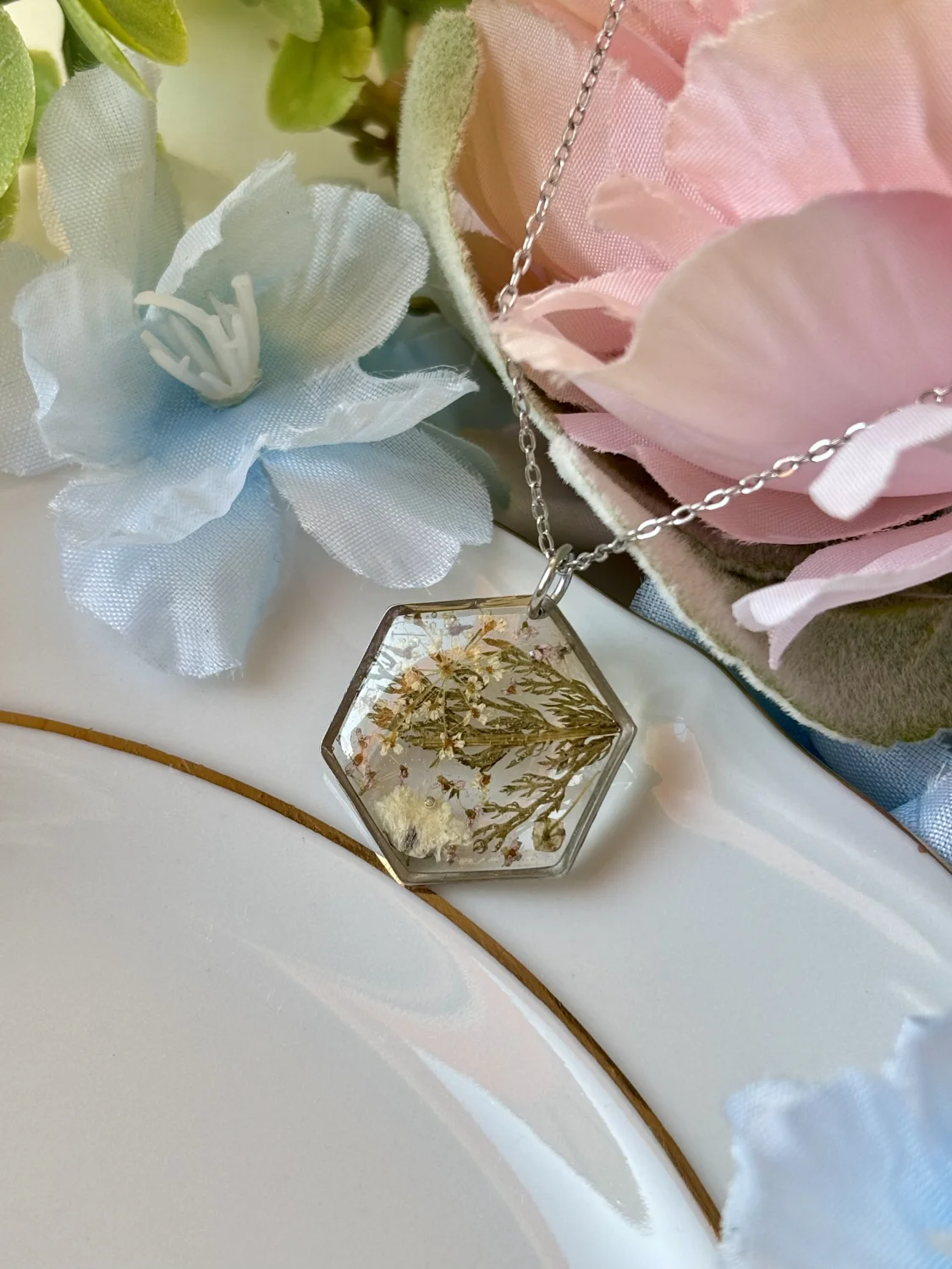 Piękny naszyjnik z ręcznie robioną zawieszką z żywicy z kwiatami